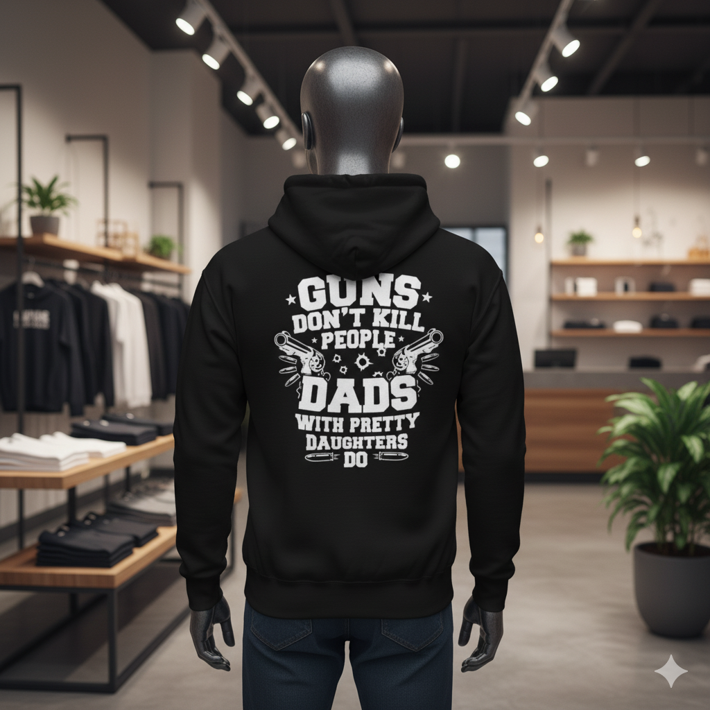 - 🔫 Back Graphic That Talks Tough: “GUNS DON’T KILL PEOPLE – DADS WITH PRETTY DAUGHTERS DO” wrapped in illustrated revolvers and vintage grit. It’s playful, protective, and built for bold entrances.